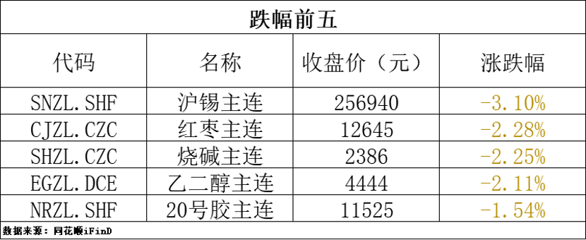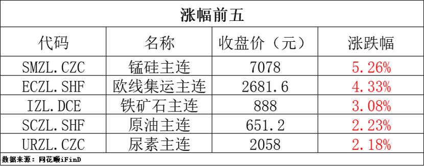 4月24日收盘,国内商品期货多数收涨,锰硅涨超5%,欧线集运涨超4%,铁矿石涨超3%,原油、尿素涨超2%。沪锡跌超3%,红枣、烧碱、乙二醇跌超2%,苹果、20号胶跌超1%。